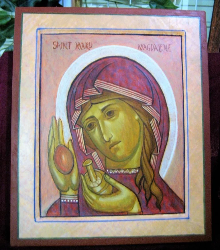The symbolism of the egg held by St Mary Magdalene is derived from the traditions of the Eastern Orthodox Church. These include a story that the Magdelene visited the Roman Emperor Tiberius, presenting him with an egg, which miraculously turned red as a sign from God of the truth of Christ’s Resurrection. She also holds the pot of spices which she had brought to the tomb to anoint Christ’s body (Mark: 16.1).