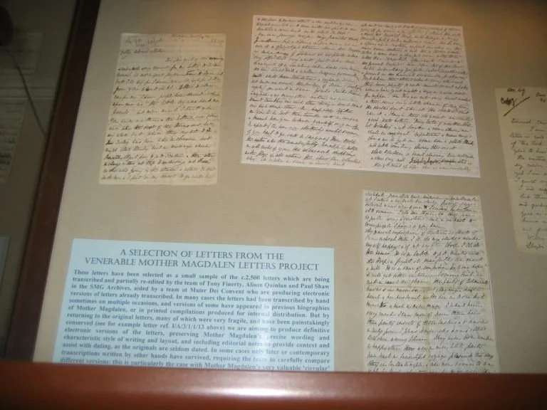 The letters on display have been selected as a very small sample of the c.2,500 surviving letters, which have been transcribed and partially re-edited by the team of Tony Finerty, Alison Quinlan and Paul Shaw in Brentford. The transcribers have been ably aided by a team at Mater Dei Convent in Rome, who have been producing electronic versions of letters already transcribed, and many other SMG Sisters in England who have been involved at one time or another on this challenging project. The vast majority of the original letters are held in the congregational archives in Brentford, though the archives team are very grateful to archivists in other institutions who have assisted in giving access to letters of Mother Magdalen in their collections (such as the Birmingham Oratory archives, and the archives of the Archdioceses of Liverpool, Southwark and Westminster).