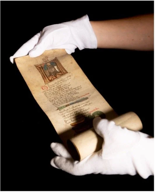 Our host for the day was Dr Hannah Thomas, Special Collections Manager at the Bar Convent, and she has a fascinating collection of archives, artefacts and rare books under her care. There is a beautiful and extensive exhibition in the convent, the Living Heritage Centre, which is a must-see for anyone interested in the history of the religious life, or of Catholicism in York. At lunchtime there was an opportunity to visit the heritage centre and see the rediscovered ‘Arma Christi’ scroll, on display in the new Treasures Gallery. This is one of a very few surviving illuminated medieval manuscripts portraying the iconography of the instruments of Christ’s passion, in combination with a prayer poem to the ‘Vernicle’ or Veronica, the image of Christ’s face miraculously imprinted on a piece of cloth. It is interesting to note that Mother Magdalen herself had a great veneration for the ‘Holy Face’ of Jesus, a devotion which came to fresh prominence in late nineteenth-century France.