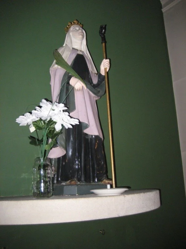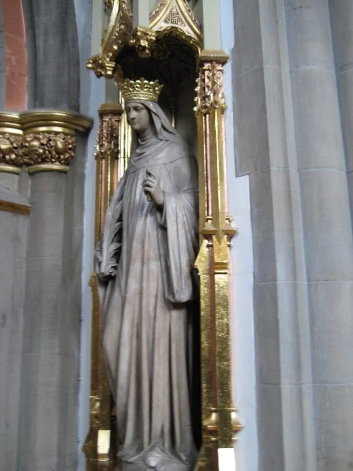 The noble statue of the saint depicted left is in St Marie’s Cathedral, Sheffield, a handsome Victorian Gothic revival building. She constitutes the most prominent feature of a beautiful side chapel in the chancel of the church, replete with images of female saints and religious. In contrast, the smaller image (right) is the focus of a similarly placed chapel in the elegant Edwardian classical-style church of Our Lady of Loreto and St Winefride at Kew Gardens, west London. Mother Magdalen would no doubt be very gratified to know of this dedication to one of her favourite saints so near to her own English home at St Mary’s Convent, Brentford, where there is currently a small temporary exhibition devoted to St Winefride. I am very grateful to both churches for permission to reproduce these photographs of their beautiful devotional statuary.