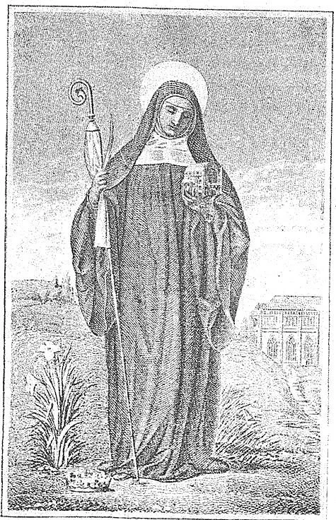 The beautiful engraving of St Winefride (right) from Mother Magdalen’s book depicts her haloed as a saint, and in the habit of a nun, carrying in her right hand the crozier of an abbess and what appears to be the palm of martyrdom. She is in meditative pose, and to her right are a crown and perhaps lilies, probably reflective of her purity and sacrifice of status in becoming a religious. In her left hand, she seems to be holding her own reliquary shrine, whilst in the background is the chapel and well chamber at Holywell. This beautiful chapel, with its elaborate late Gothic canopy over a large pool of living water, and fine upper storey next to the ancient parish church, was remarkable for its virtually intact survival throughout the Reformation period. Miraculous cures were reported throughout the history of the site, attributed to the intercession of the saint, and reports of healings continue to this day. The first ‘lives’ of St Winefride were not written until the twelfth century, with the transfer of the saint’s corporeal relics to Shrewsbury Abbey.